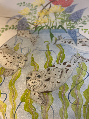I realized I needed to add more, but different, kelp to balance the image. Also, I reminded myself that it wasn't a fishbowl that I had painted the seals swimming across, it was a ceramic vase. I decided to paint coral like kelp along the base and to paint the coral a white that would look like ceramic glazing. I also added in the far lower left corner of the vase an artist's stamp like the stamps on some of my own collected ceramic ware. See the photos below: